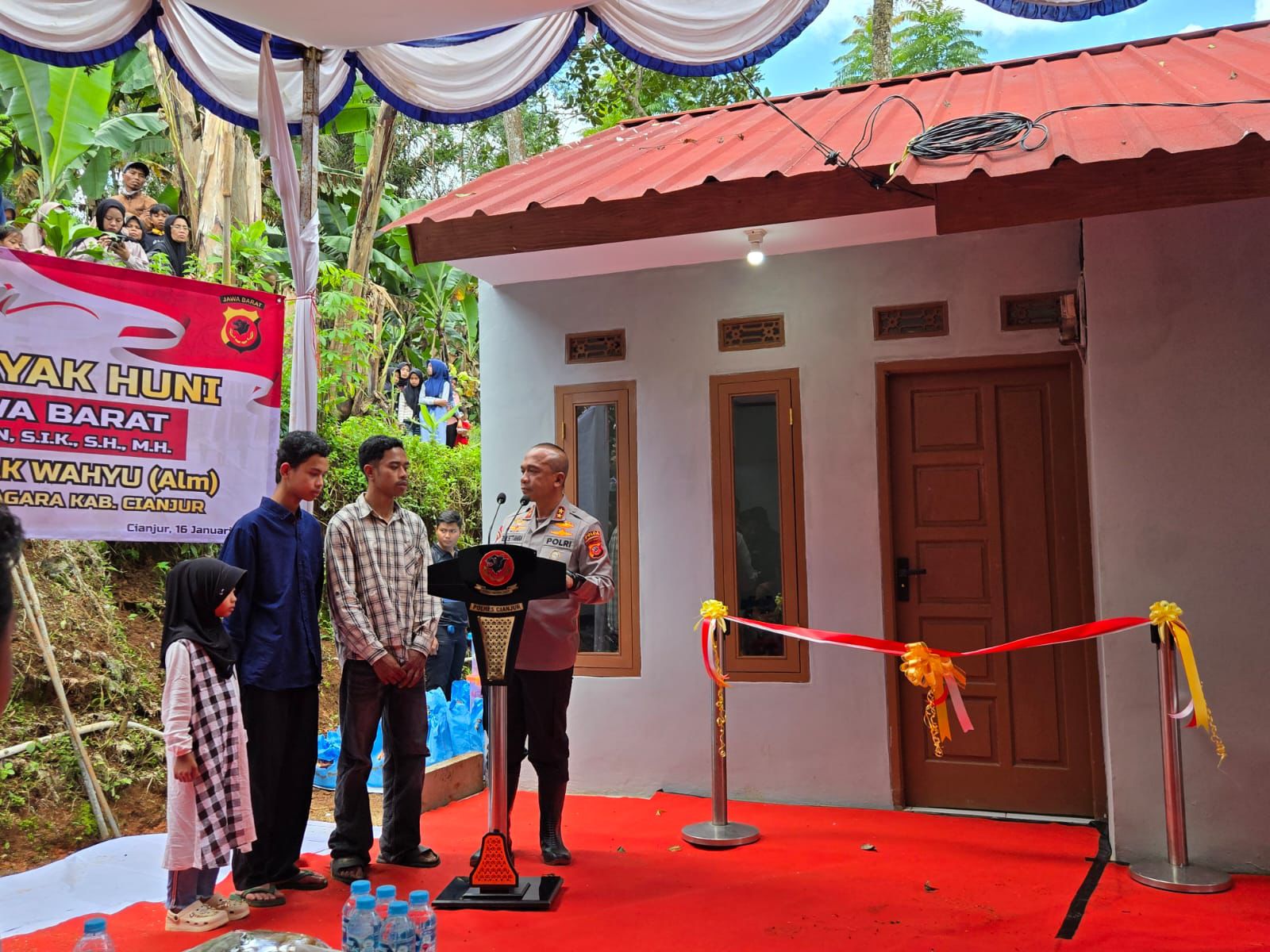“Alhamdulilah kami dari Polda Jabar bekerja sama dengan Pemerintah Kab. Cianjur serta komunitas sosial Bagong Mogok, hari ini menyerahkan rumah yang telah dibangun untuk keluarga almarhum Wahyu, Tiga orang putra putrinya diharapkan nantinya akan hidup layak tinggak di rumah yang telah kami bangun bersama.” ujar Kapolda Jabar.